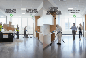 Services include rough cleaning, final cleaning, highly detailed “final final” inspections, and a final return visit for complete delivery. This process ensures the property is perfectly prepared for owners, inspectors, and end-use.
